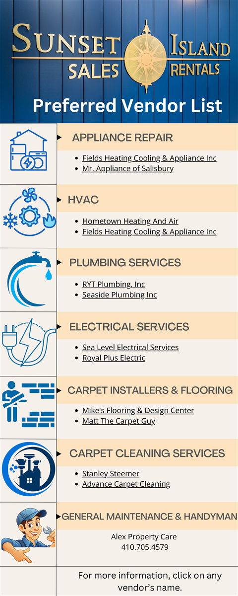 Caring for your Sunset Island property just got easier. We are excited to share our Exclusive Preferred Vendor List, a carefully selected group of trusted professionals who help our homeowners protect, maintain, and enhance their investment.Each vendor on this list has been vetted for quality, reliability, and service, ensuring you have access to skilled experts you can count on—whether you need routine maintenance, repairs, or special projects around your home.